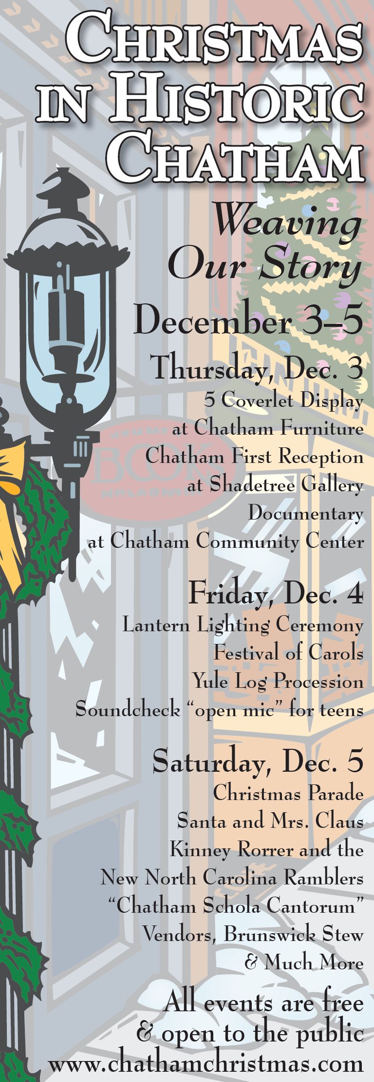 Mark your calendars now to enjoy “Weaving Our Story,” the 2009 theme of Chatham's Christmas festival dating from the early 1980's. (Scroll down this page to see the full schedule of events below.)
