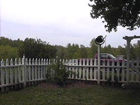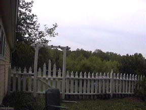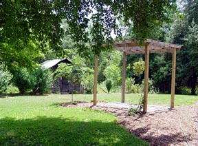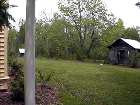 | View from French doors patio to NE. One dependency (potting shed) shown in backyard. You can see the roof of the chicken house in the background. | ![]() |